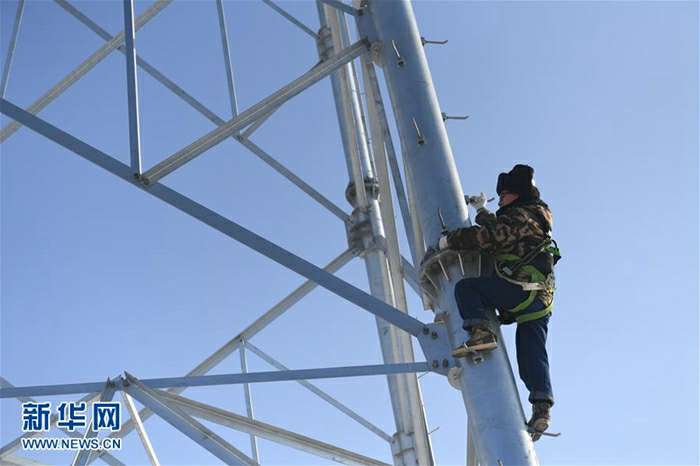 1月26日,国家电网长春供电公司输电运检室带电作业班班长杨忠武徒手爬上高压线塔。新华社记者 张楠 摄